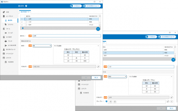 帳票クリエータ Ver.4では、従来製品の帳票クリエータ Ver.3の機能に加え、帳票出力に必要な集計機能を強化しました。帳票で利用されるケースの多い加算や乗算に加え、集計単位の指定が必要な合計や累計も、GUIで集計の種類と集計対象項目、集計単位を設定するだけで集計できます。