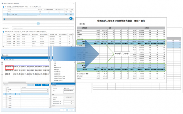 また、明細のヘッダ、フッタ機能が加わりました。GUIでヘッダ、フッタのレイアウトと出力条件を設定するだけで、明細にヘッダ、フッタを出力できます。集計機能と明細のヘッダ、フッタ機能を利用することで、明細付き帳票に要求されることの多い明細の合計行を任意の集計単位で出力することができます。