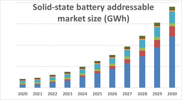 IDTechExは、全固体電池の市場は10年間のうちに70億ドルの規模に達するものと予測しています。