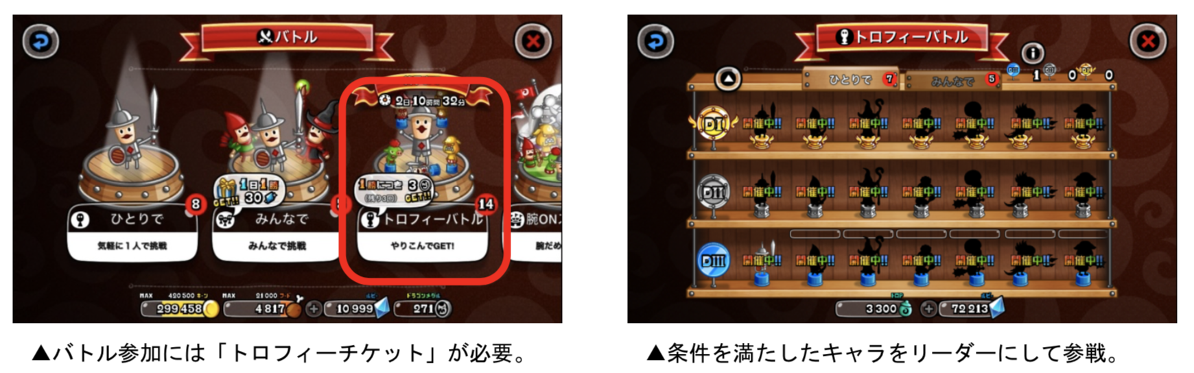 トロフィーバトルは、出場条件を満たしたキャラをリーダーにして戦い、“トロP”を獲得することが目的のバトルです。