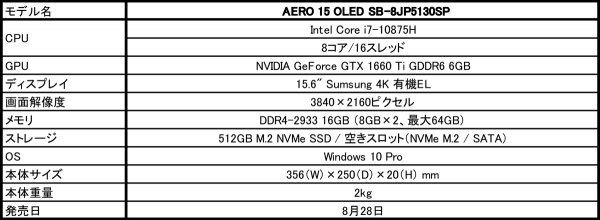 AERO 15 OLED SB-8JP5130SPは、4K解像度の15.6型Samsung製有機ELパネルを採用し、CPUに8コア/16スレッドのIntel Core i7-10875H、GPUにNVIDIA GeForce GTX 1660 Ti 6GBを組み合わせたモデルです。メモリはDDR4-2933を16GB(最大64GBまで拡張可能)、ストレージは512GBのM.2 NVMe SSDをそれぞれ装備。マルチスレッド性能が要求されるクリエイティブアプリケーションを快適に動作させることができます。また、OSにはWindows 10 Proを採用しており、テレワークでの使用にも適したモデルとなっています。
