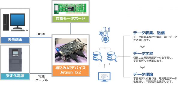 本システムは組込みAIデバイス「Jetson TX2」(NVIDIA社)に各機能を組み込んだハードウェアパッケージ(1セット20万円~)として提供します。モータに接続するだけでデータの収集と蓄積、予兆検知モデルの学習、モデルを用いた推論による異常予兆検知が可能です。また、すべての処理を「Jetson TX2」内で行うためサーバーやネットワーク環境に依存することなく利用できます。