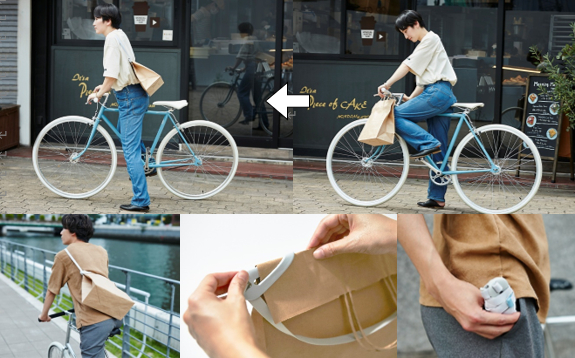 自転車で買い物に行って荷物が増えると、カゴがついていない場合はハンドルにかけることになりますが、車輪への巻き込みで転倒があったり、ペダルを漕ぐ度に荷物が膝にあたる、ハンドルが切りづらくなるなど、不便に感じる点が多いです。また、荷物が増えたときを想定してリュックにするなど、カバン選びにも制限が出てしまいます。そんな悩みを解決したいと新たに開発したのが、「ショルダークリップ」です。使い方も形状もなるべくシンプルに、紙袋がファッションアイテムになるようなデザインを目指しました。最小限のパーツ構成で、着脱時の操作を極力省けるよう検証を繰り返し、ポケットに収まるサイズ感と操作性を実現しました。