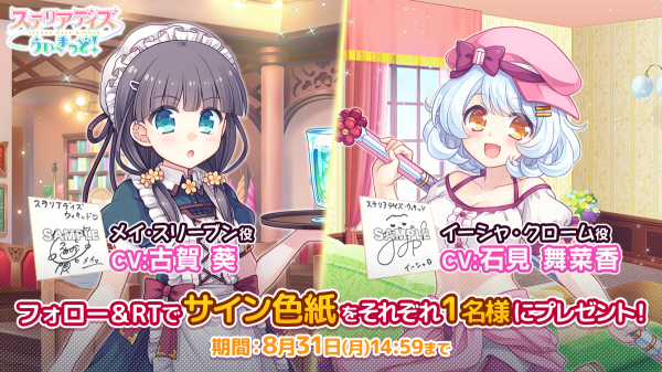 公式Twitterでは、「古賀葵さん(メイ役)」「石見舞菜香さん(イーシャ役)」2人の直筆サイン色紙プレゼントキャンペーンを実施いたします。