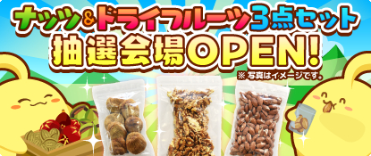 抽選で【ナッツ&ドライフルーツ3点セット】が当たるよ。