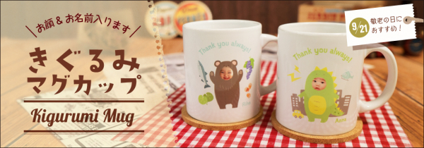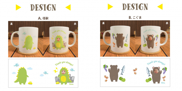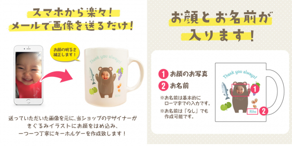 きぐるみマグカップは、「お子様の顔写真」と「可愛いきぐるみイラスト」を組み合わせて作る、ゆるくて可愛いオリジナルマグカップです。注文後、使用するお写真をメールでご送付いただくだけ。送っていただいた画像をデザイナーが一つ一つきぐるみイラストにはめ込み、丁寧にデザインを作成致します。