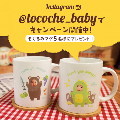 きぐるみマグカップ 新発売記念として、現在tocoche(トコシェ)のInstagramアカウント(@tocoche_baby)においてプレゼントキャンペーンを開催中です。