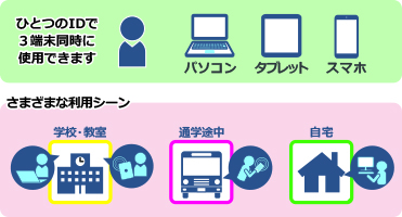 (例えば、学校での学習用端末、生徒個人のスマートフォン、自宅でのパソコンなどで利用可能)