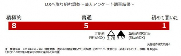 アンケートでは、革新的な取り組み(攻めのDX)への意欲とIT刷新(守りのDX)に対する意欲、それぞれについて8段階の数値(「8」が積極的、「5」が普通、「2」が消極的、初めて聞いたを「1」としている)で回答を得た。そのため、数値が大きいほど積極的であることを示している。