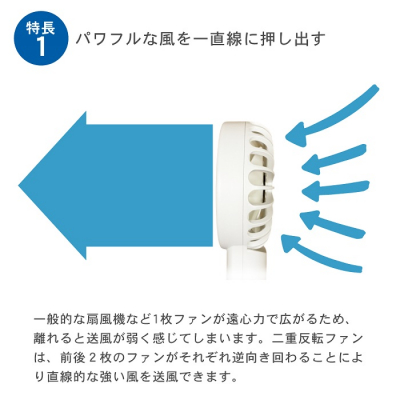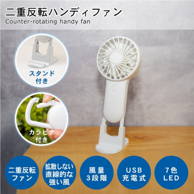 自宅からアウトドアまで多機能で使える「二重反転ハンディファン」をミスターカード株式会社から2020年8月25日(火)に発売いたします。一般的なハンディファンは風が広がりやすく風量が弱くなってしまうのですが、2枚の羽根を逆に回転する二重反転だと直線的な強い風を送って涼しむことができます。弱中強の3段階風量を調整可能。カラビナ付きなので、バックやベルトでかけて持ち運べます。スタンドを使えば自宅やオフィスで卓上扇風機として使うことができ、スマホスタンドとして動画視聴など楽しめます。USB充電式なので最長180分使用可能です。週末や連休などのアウトドアで、熱中症対策や蚊などの虫よけ、バーベーキューの着火時にとっても便利なマストアイテムは如何でしょう。