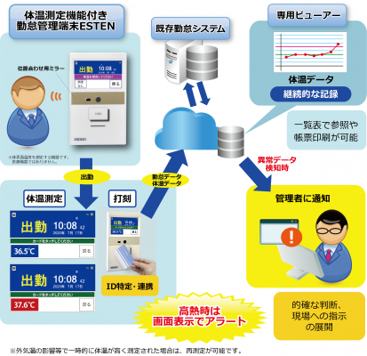 「ESTEN」は、30年以上にわたりシステムタイムレコーダーを製造・販売してきたセイコーが、培ってきたノウハウやニーズを基に開発したICカードリーダー端末です。従来の「ESTEN 勤怠エディション」は、勤怠管理用端末として、病院、ホテル、学校、製造業など、さまざまな業種に多くの導入実績があります。今回販売を開始する「ESTEN TE-C800T」では、出勤打刻時に体温測定を同時に行うことにより、体温異常者がいた場合、即座に管理部門に連絡を取る適切な対応が可能になります。
