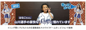 ライオンズファンクラブジュニア会員の子どもたちに募集を行い、1試合につき毎回5名が当選します。当選した子どもたちは選手への応援動画を事前に撮影し、試合当日は球団で確保した席で「SEEDキッズエール」オリジナルユニフォームを着用し観戦を楽しみます。そして、イニング間に、事前に撮影しておいた応援動画がLビジョンにて放映され、選手にメッセージを届けます。