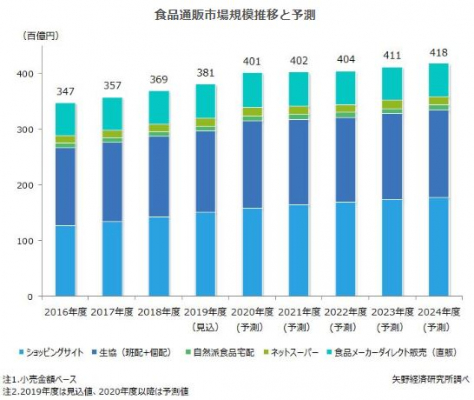また、年度末から新型コロナウイルス感染拡大の影響により、スーパー店頭での密集を避けるために通販で食品をまとめ買いするといった購買行動が広がった。ただ、コロナ禍においては緊急事態宣言が発令された4月以降に影響が拡大したことから、2019年度の食品通販市場は前年度並みの伸長率を見込む。