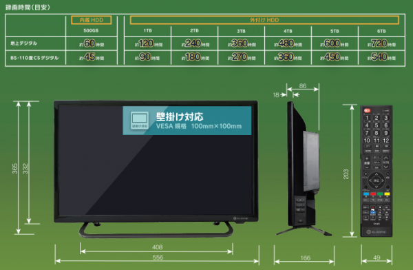 HDD内蔵モデルだからこそスタイリッシュに設置できるように、「VESA規格」に対応し、壁掛け、壁寄にも対応。ノジマ全店及びノジマオンラインでは、各種壁掛け、壁掛けスタンドをご用意し、お客様の使用環境に合わせたご提案をさせて頂きます。