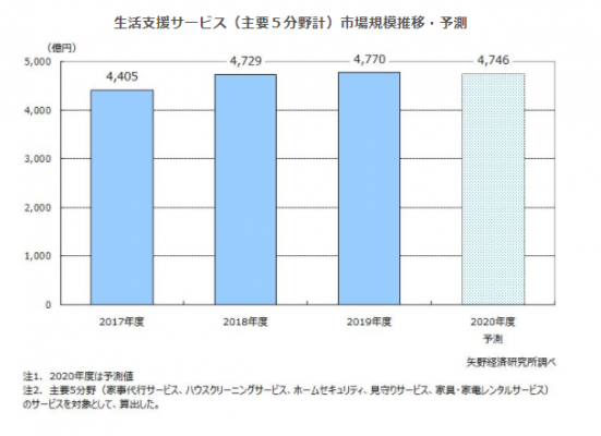 2019年度の生活支援サービスの主要5分野(家事代行サービス、ハウスクリーニングサービス、ホームセキュリティ、見守りサービス、家具・家電レンタルサービス)の市場規模を前年度比0.9%増の4,770億円と推計した。