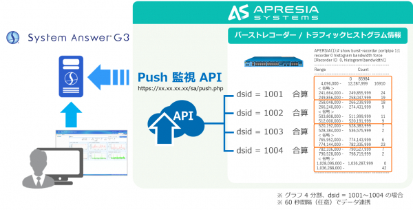 そこで、ICT システムの性能監視に長年取り組んできた専門ベンダーである IBC と、国内ネットワーク機器メーカーの草分け的存在である APRESIA Systems が手を組み、「バーストレコーダー」のヒストグラム(度数分布図)情報を「System Answer G3」が受け取れる形式に変換して API 連携するスクリプトを 2019 年 6 月に開発しました。