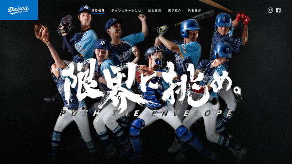 野球部サイトは「男性らしさ・かっこよさ」をイメージし、全体をシックな黒で統一しました。野球選手として、そしてビジネスパーソン・物流クリエイターとして、 完成形を決めず挑戦し続けたいという想いを込めたチームスローガン「限界に挑め。」を筆で書いたようなデザインで表示することで、力強さやチャレンジ精神を表現しています。コンテンツは「新着情報」「ダイワのチームとは」「試合結果」「選手紹介」「代表挨拶」を用意。試合結果は創部以降のオープン戦・公式戦の試合結果を、選手紹介は選手一人ひとりのプロフィールを掲載しています。野球部だけでなく、当社に興味を持ち、深く知ってもらえるように会社ホームページと採用サイトのリンクを設定しています。また、お問い合わせフォームからはオープン戦の申し込みも可能。学生への認知度向上だけでなく、野球界での交流の輪を広げたいと考えています。