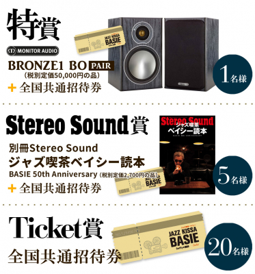 特賞にはスピーカー※1 &チケットを1名様や、またStereo Sound賞として「ジャズ喫茶ベイシー読本 BASIE 50th Anniversary」&チケットを5名様、そして全国共通招待券を20名様にプレゼント致します。