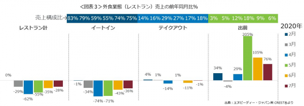 外食業態計(レストラン計)の売上前年同月比を利用形態ごとにみてみると(図表3)、出前の大幅増が続いていて、4月は29%増、5月は205%増、6月は105%増でしたが、7月も76%増と2桁成長となりました。イートインの回復と出前へのシフトで、テイクアウトは減少しました。