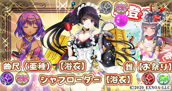 浴衣(紫)属性期間限定SSR「曲尺(亜種)【浴衣】」、浴衣(灰)属性期間限定SSR「シャフローダー【浴衣】」、お祭り(赤)属性期間限定SR「錐【お祭り】」が金ガチャに登場!