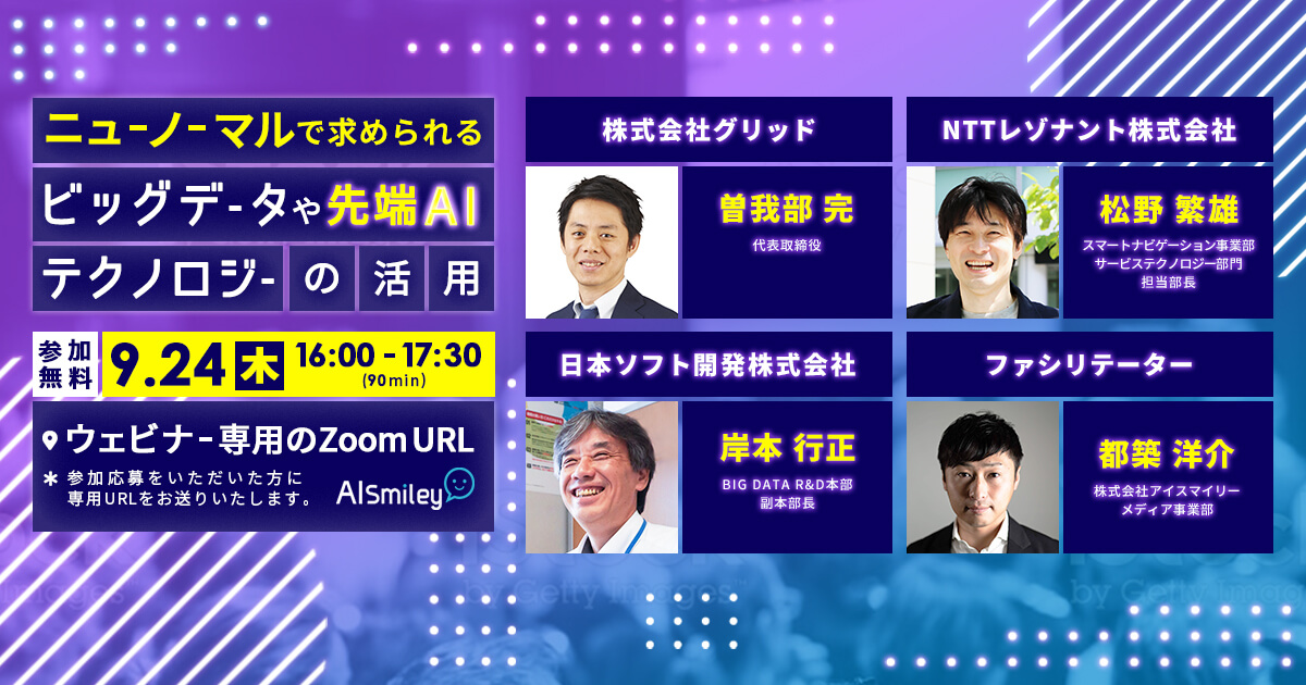 人工知能を搭載したサービスの資料請求ができるAIポータルメディア「AIsmiley」を運営するアイスマイリー(東京都渋谷区、代表取締役:板羽晃司)は、9月24日(木)16時から、ニューノーマルで求められるビッグデータや先端AIテクノロジーの活用をテーマにウェビナーを開催いたします。