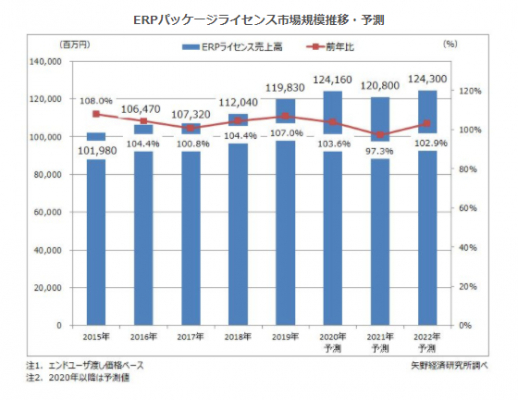 2020年以降は新型コロナウイルス感染症による影響が懸念されるものの、2020年8月時点では上期(1~6月)までのERPパッケージベンダー事業への影響は軽微である。2020年通年でみても、好調だった前年に決まった受注案件への対応もあるため、2020年のERPパッケージ市場は1,241億6,000万円、前年比3.6%増とプラス成長を維持する見通しである。