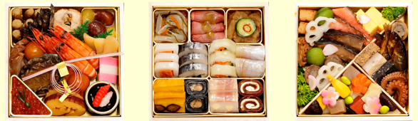 壱の重は、お正月にふさわしい縁起物の食材を彩り良く盛り付け、新年を迎える喜びを華やかに表現。弐の重は、五感の味覚をふんだんに詰め込み、飽きを感じさせない色彩豊かなお重に仕上げました。参の重は、焼き物、煮しめなど山海の幸を盛り沢山に詰め合せた、食べ応えのあるお重です。伝統的な和食を中心に、鮑うま煮やさごし生寿司酢〆などの魚介料理、ローストビーフや合鴨和風ロースト等の肉料理をバランス良く織り交ぜ、美しく盛り付けたこだわりの三段重おせちです。