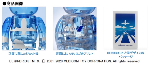 今回販売する『BE@RBRICK for ANA』は、当社とのコラボ初のスケルトン仕様のBE@RBRICKです。滑走路から青空にはばたくANA機をイメージし、クリアな青のボディに真っ白なジェット機等をデザインしました。100%と400%のセット商品です。