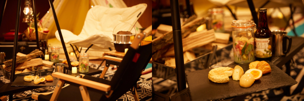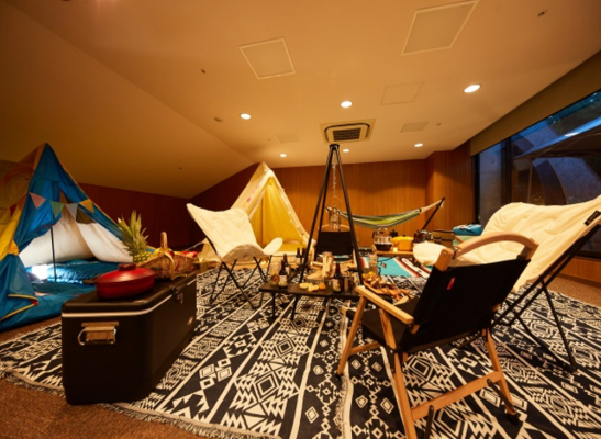 ホテルの小宴会場をグランピング空間にリニューアル。広い空間にテントやハンモックを入れ優雅なアウトドア空間を演出、テント2棟にハンモック、囲炉裏スペースにバルコニーではBBQコンロ。富士山を眺めながら優雅なひと時を過ごせます。