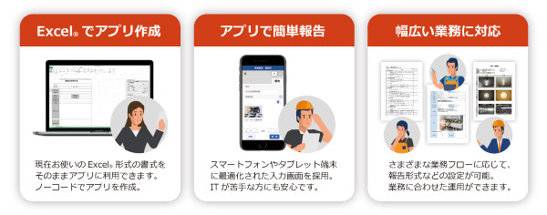 これまで使用してきたExcel(R)で作成した帳票をそのまま活用。開発の知識がなくても、Excel(R)を使って、モバイルに最適化された業務報告アプリをわずかな時間でつくることができます。