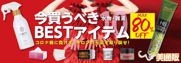 「美通販」では、サロンメニューの主流である人気の水物・雑貨アイテムを各種ピックアップ。衛生管理に力をいれながら現場で頑張るサロン様を応援する思いで、「コロナ禍に負けず、サロンの元気を取り戻せ!今買うべき水物・雑貨BESTアイテム」キャンペーンと称し、MAX80%OFFの業界最安値を目指した美通販会員特別価格でご提供いたします。期間は2020年10月31日(土)まで。この機会にコスト・経費の削減・売り上げアップのお役に立てていただきたい次第です。