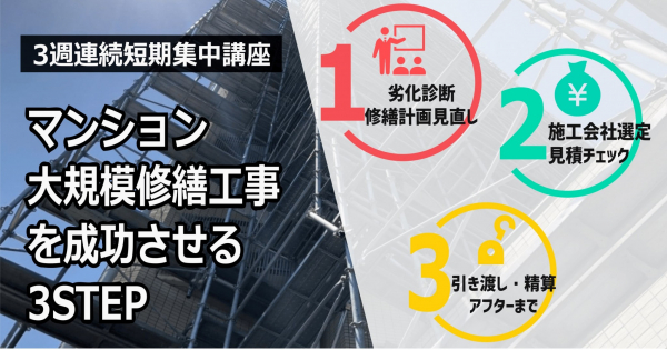 本セミナーでは、【事前準備】【施工会社選定・発注】【着工後・引き渡し・アフター】の3STEPを3週に分け、大規模修繕工事の成功への秘訣を解説します。多数の実例を交えつつ、それぞれの注意点をコンパクトにお話します。ご希望の回だけのご視聴も可能です。先々の大規模修繕工事に向け、準備の第一歩としてお気軽にご参加ください。