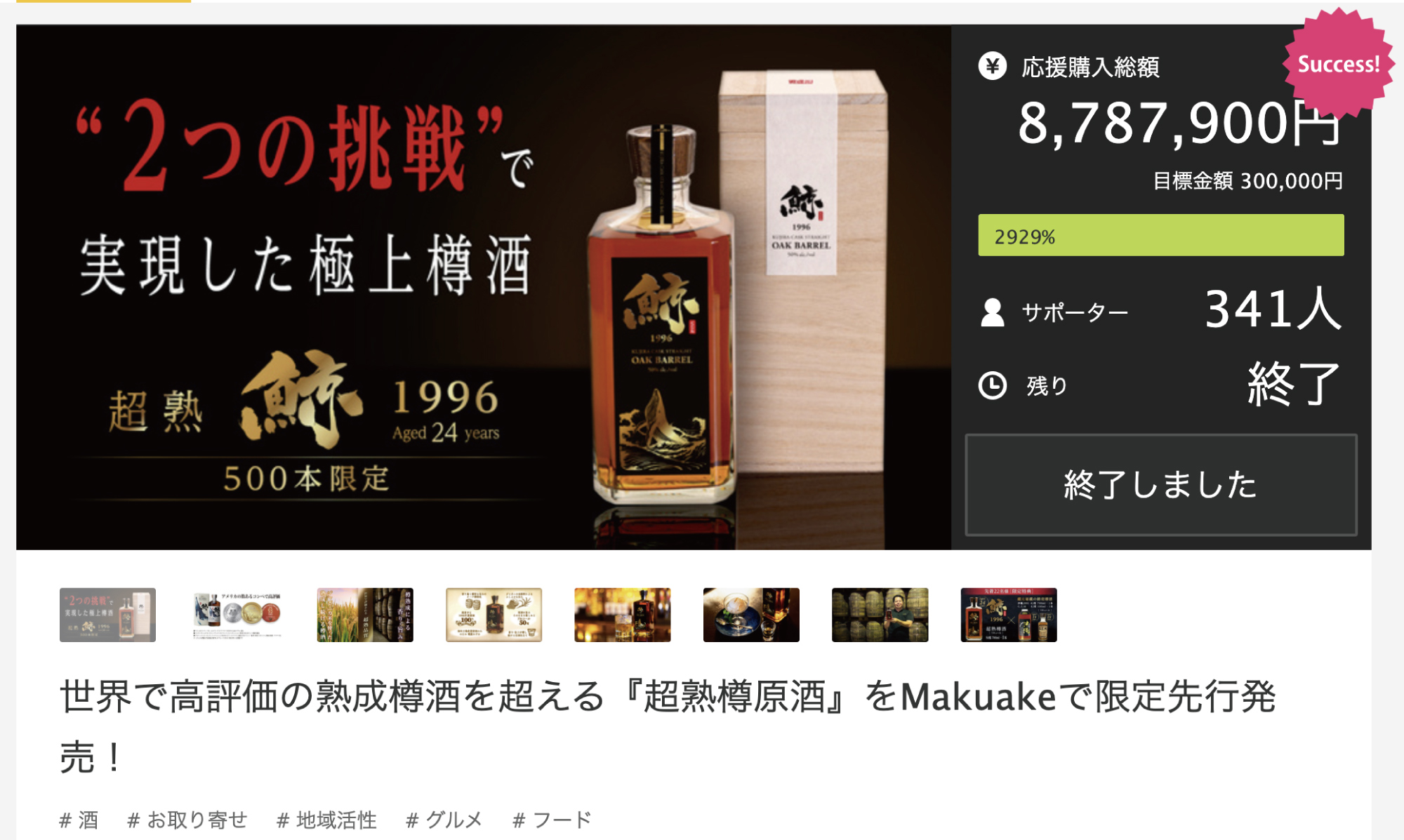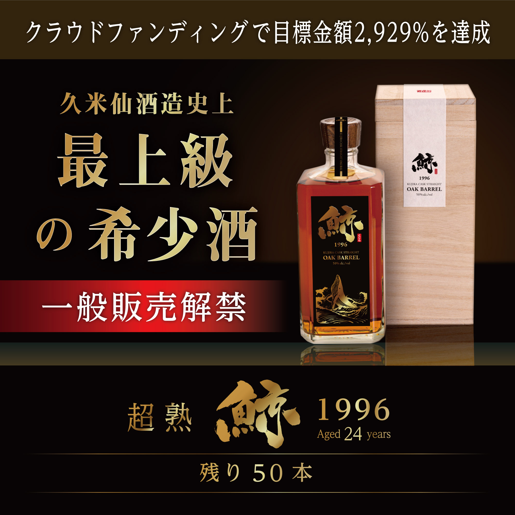 超熟『鯨 1996』は、久米仙酒造のお酒の中でも最上級と言える樽熟成酒。クラウドファンディング挑戦を機に500本限定で製造された商品ですが、当初の見込みを大きく上回る反響でクラウドファンディングに出品していた450本が予約完売。残り50本が一般販売となります。24年熟成の残数わずかの希少なお酒です。50本完売後の製造予定はございません。BARや酒販店様、ウイスキーファンの皆様はお早めのご購入をよろしくお願い致します。