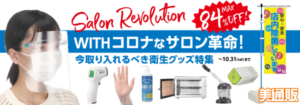 パンデミックの終息はみえていないものの、少しずつ自粛緩和がされ始めている今日この頃。この状況に対応するべく、理美容室やエステ・ネイルサロンでもより一層のwithコロナなサロンづくりが求められています。そこで「美通販」では、「withコロナなサロン革命」と題し、今取り入れるべき衛生グッズを多数ピックアップ致しました。スタッフやお客様の安心・安全を守るために欠かせないアイテムを、最大84%OFFの業界最安値を目指した美通販会員特別価格にてご提供致します。この機会に、頑張るサロン様の感染防止対策のお役に立てていただきたい次第です。