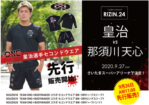自身の生涯をかけてさらなるステージを目指す皇治選手。その思いが実現、9月27日那須川天心選手と対戦が決定しました。その参戦記念として「TEAM ONE × BODYMAKER コラボセコンドウエア」を9月28日より販売開始。そして今回、待ちきれないファンの方にBODYMAKERオンラインストアで試合前日の9月26日より先行販売が決定!