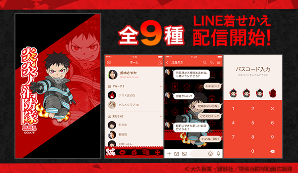 TVアニメ「炎炎ノ消防隊」の主要登場キャラクターが可愛らしいSDキャラクターになってLINE着せかえに新登場!!各キャラクターに合わせたメインカラーと炎炎の消防隊の世界観を詰め込んだアイコンやトーク画面。年齢・性別問わず使いやすいLINE着せかえとなっております。今後も他主要キャラのLINE着せかえも続々とリリース予定となっておりますので、お気に入りのキャラLINE着せかえでお楽しみください。