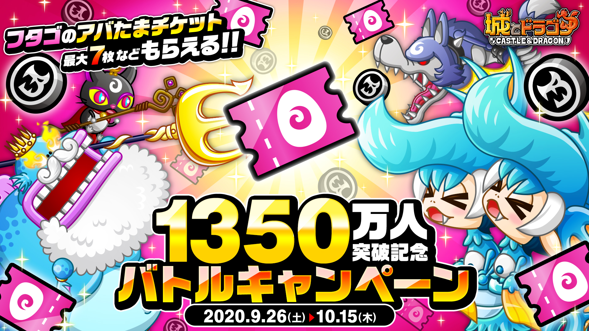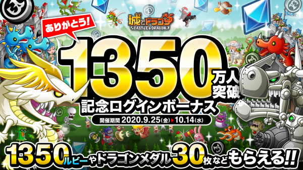 株式会社アソビズム(本社:東京都千代田区、代表取締役:大手智之)は、App Store・Google Playにて好評配信中の『城とドラゴン』で、2020年9月25日(金)より「1350万人突破記念ログインボーナス」を開催いたします。