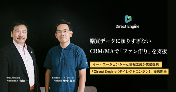データ起点のデジタルマーケティングサービスを手掛ける株式会社イー・エージェンシー(本社:東京都千代田区、代表取締役:甲斐真樹、以下イー・エージェンシー)は、シナリオ型CRMセンター構築・運用を手掛ける情報工房株式会社(本社:大阪府大阪市、代表取締役社長:宮脇一、以下情報工房)と、CRM/MA領域でのサービスやプロダクトの共同開発に向け業務提携し、両社の強みを活かして、CRM(顧客管理)を中核としたクラウド型ツール「DirectEngine(ダイレクトエンジン)」の提供を2020年9月28日に開始いたしました。