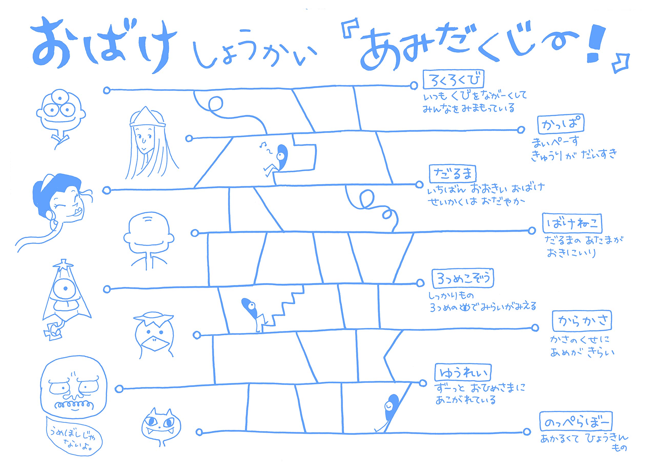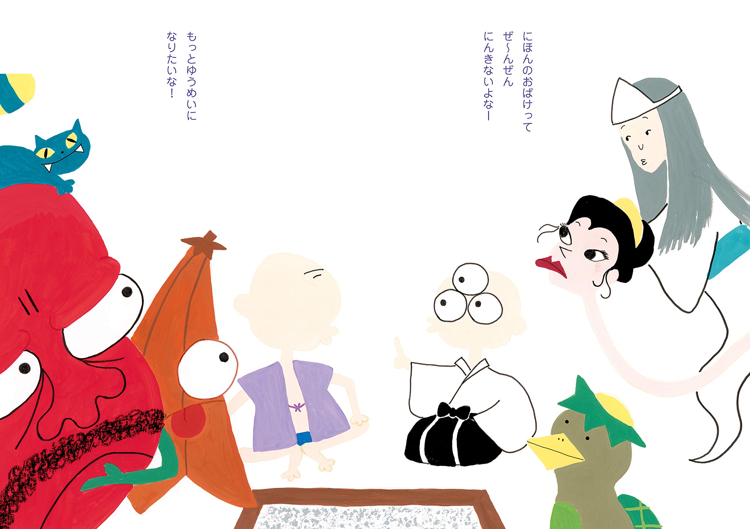 関西弁のかっぱや、ばけねこ、のっぺらぼうが驚いたり、喜んだり。