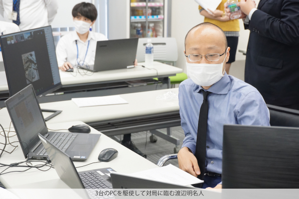 渡辺名人はPCを5台並べ、同時に3名とオンライン対局を行う形で席を構えました。対局中は、渡辺名人の師匠である所司和晴七段の生の解説が行われるという豪華なシチュエーションが実現。渡辺名人から対戦者に対して「強い」と声が上がる場面もあり、優勝者の実力が伺えました。