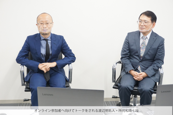 後半の対談パートでは、師匠である所司和晴七段との師弟対談が実現しました。渡辺明名人が20歳で竜王位のタイトルを獲得された際のそれぞれの思いや、門下生時代の印象など将棋ファン垂涎の内容が多く語られました。また「対局中は将棋以外のことを考えているのか」「お互いの好きなものを知っているか」など参加者からのライトな質問にまで、ざっくばらんにお話しいただきました。