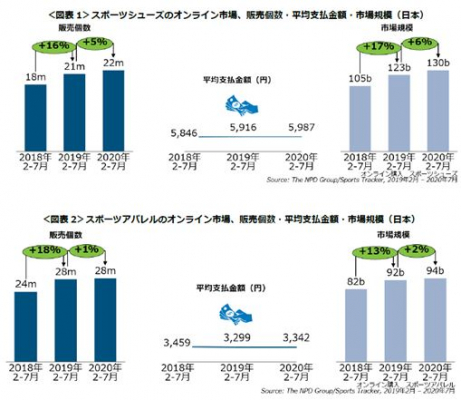 コロナ禍の2020年2-7月期、日本におけるスポーツシューズ市場規模は、オフライン売上高が前年同期比22%減と大幅減となる中、オンライン売上高では前年同期比6%増でした<図表1>。販売個数(+5%)と平均支払金額(+1%)が増加しました。スポーツアパレル市場規模も、オフラインでは同28%減と大幅減でしたが、オンラインでは同2%増でした。平均支払金額増加(+1%)に加え、販売個数も増え(+1%)ました。