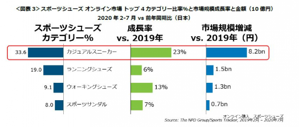 2020年2-7月期のスポーツシューズのオンライン売上高増加の主要因は、カジュアルスニーカーの売上高が23%増と大幅に成長したことでした。スポーツシューズオンライン市場で最も比率が高く、全体の3割超を占めるカジュアルスニーカーが、大きな成長を示したことが、市場全体の成長を牽引しました。<図表3>