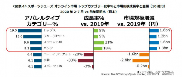 スポーツアパレルではスウェット類が21%増で、オンライン市場成長をけん引