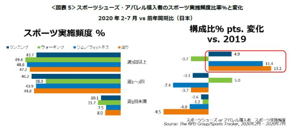 コロナ禍においては自粛が強いられ在宅での生活が長くなる中、主にヨガやフィットネス用にスポーツシューズ・アパレルを購入した消費者において、ヨガやフィットネスの実施頻度で、「週3回以上」の比率が大幅に伸びました<図表5>。
