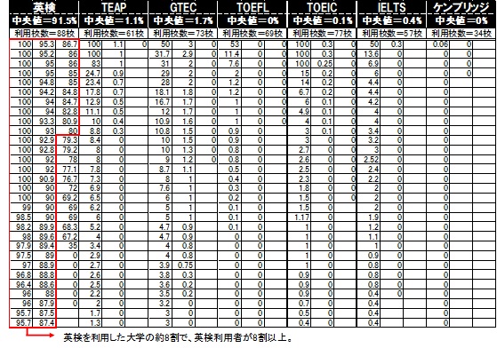 ●利用率は中央値で「英検=91.5%」。2番手の「GTEC=1.7%」、「TEAP=1.1%」を大きく引き離しました。