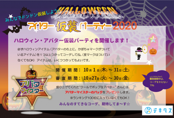 本イベントでは、ハロウィンアイテムを使ったコーディネートでデキタスを盛り上げてくれたアバターに、アバターアイテムより「アバターマイスター」のバッジをプレゼントします。