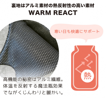 WARM REACT/裏地に熱反射性の高いアルミ繊維を使用。魔法瓶効果でじんわりしっかり保温!