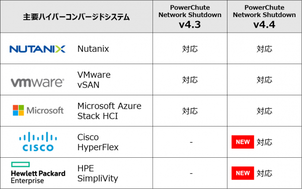 最新版「PowerChute Network Shutdown v4.4」は従来の主要な機能はそのままに、HCIの対応システムを拡張し、今まで対応していた、Nutanix, VMware vSAN, Microsoft Azure Stack HCIに加え、Cisco HyperFlex、HPE SimpliVityにも新たに対応します。さらに、シュナイダーエレクトリックではそれらのソリューションベンダーとグローバルレベルでパートナーシップを結んでいるため、最新構成にも迅速に対応できます。