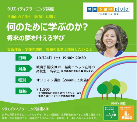 株式会社城南進学研究社(本社:神奈川県川崎市、代表取締役社長CEO:下村勝己。以下「当社」)が運営する大学受験予備校「城南予備校DUO」では、2020年10月24日(土)、新しい価値観・世界観を創造する力を鍛える「クリエイティブラーニング講座」として医師の長嶺由衣子氏を招き、「何のために学ぶのか? 将来の夢を叶える学び」をオンラインで開催いたします。